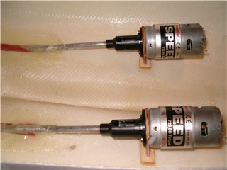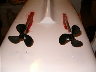 Mit den Wellen habe ich mir keine große Arbeit gemacht. Es wurden Schlitze herausgefräßt. Danach die Wellen an der richtigen Stelle mit Sekundenkleber und Aktivator angepunktet. Eine Gewebematte über die Welle gelegt und dann mit 5 min Epoxy getränkt. Danach wurde der Rumpf gedreht und die Wellen mit Technicoll verklebt. Der Kleber wird hart wie Beton und ist eine sehr klebrige Masse (wie Spachtelmasse). Das hat den Vorteil das nichts verläuft. Zum spätern Zeitpunkt werde ich noch Wellenböcke einkleben. Die Motoren entstören und dann kann es ja eigentlich zum Test in der Badewanne losgehen ( übrigens 3 cm vorne und 3 cm hinten noch Platz. Als Ruderanlagen werde ich die großen Ruder von Robbe verwenden also bestellen und abwarten...